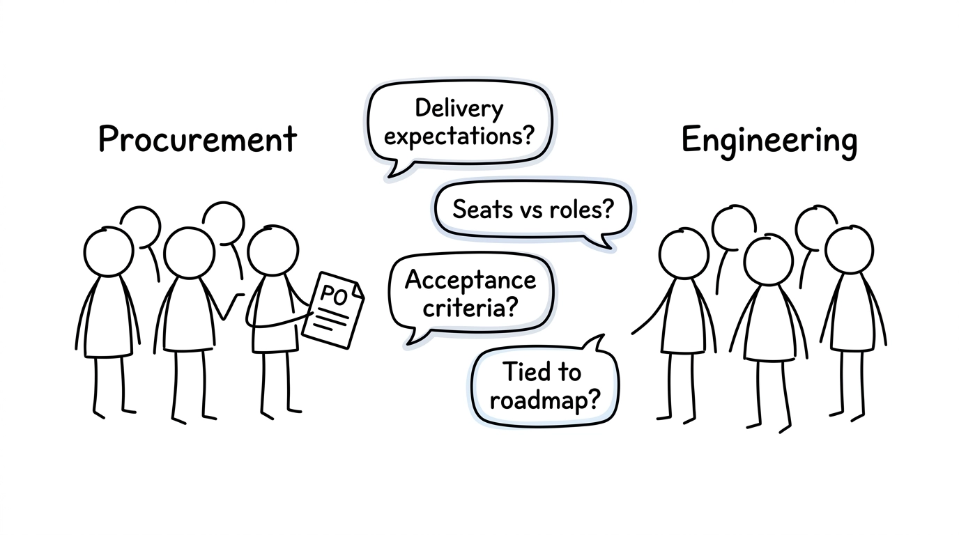 Procurement docs excel at SKUs and dollars; engineering needs acceptance-shaped outcomes. If the PO only ever says “annual subscription,” tools stay a perk, not capacity—cousin to “demo without acceptance” in 5 Early Warning Signs of Low-Quality Delivery. Minimum alignment: a short, non-legalese value paragraph in the budget pack so CFO and engineering read the same definition of worth.